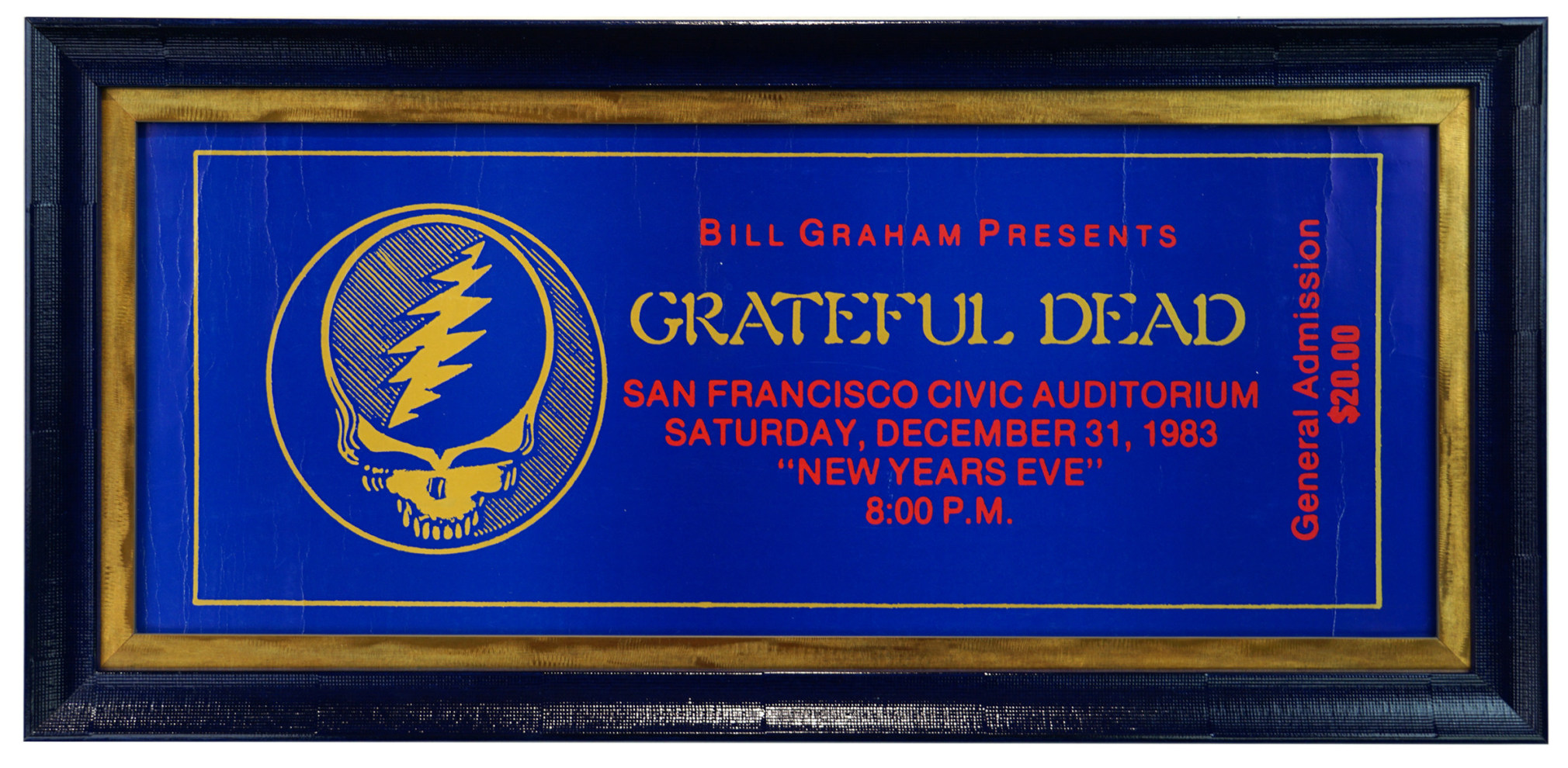 This blown-up version of the actual ticket to the 1983 New Year’s Show was a long window card used in store windows and record stores to promote the event. The event occurred at the San Francisco Civic Auditorium because the Oakland Auditorium was being renovated. It would later reopen as the Henry J Kaiser Convention Center, which essentially was the Grateful Dead’s “home court” for a few years.