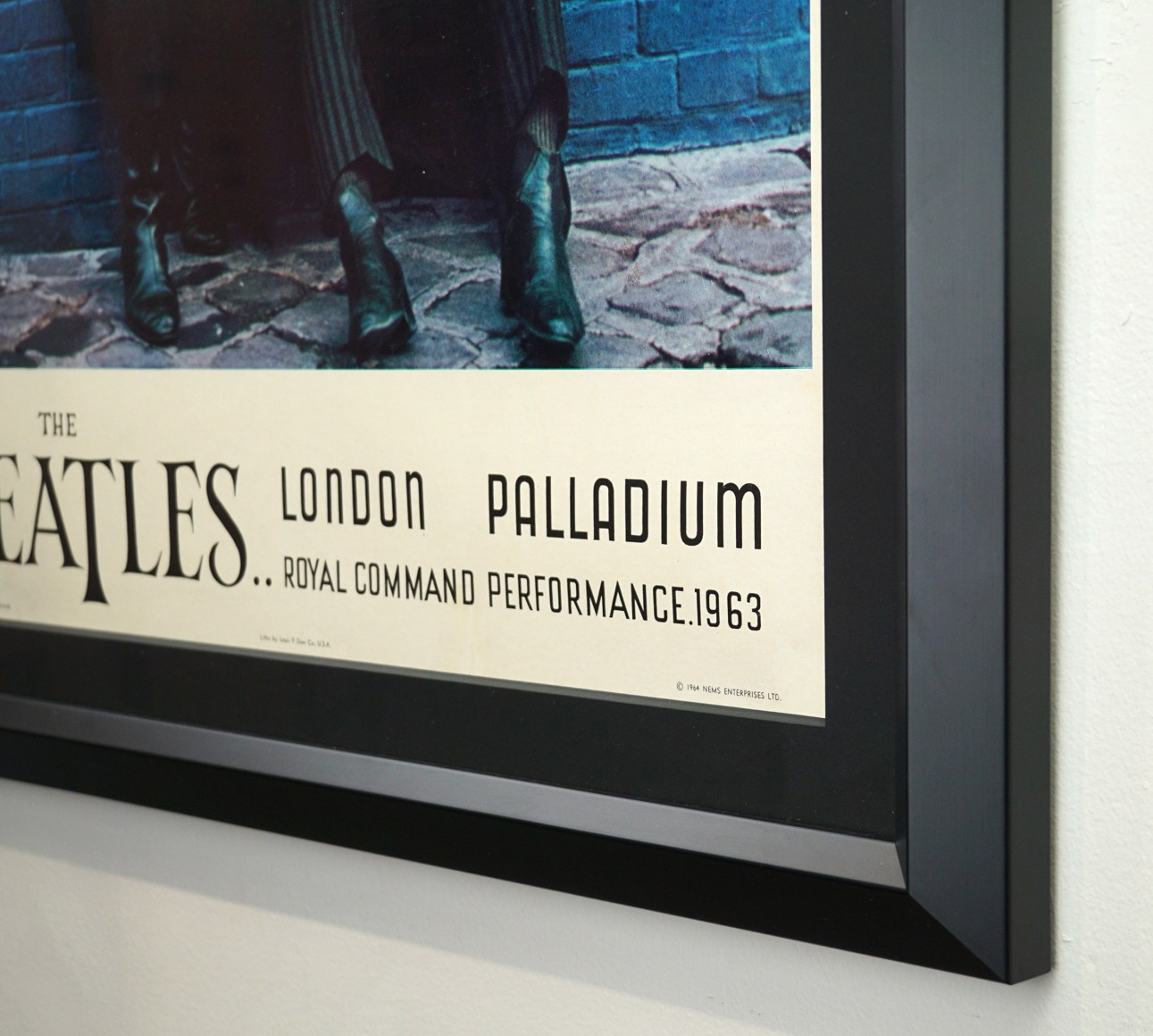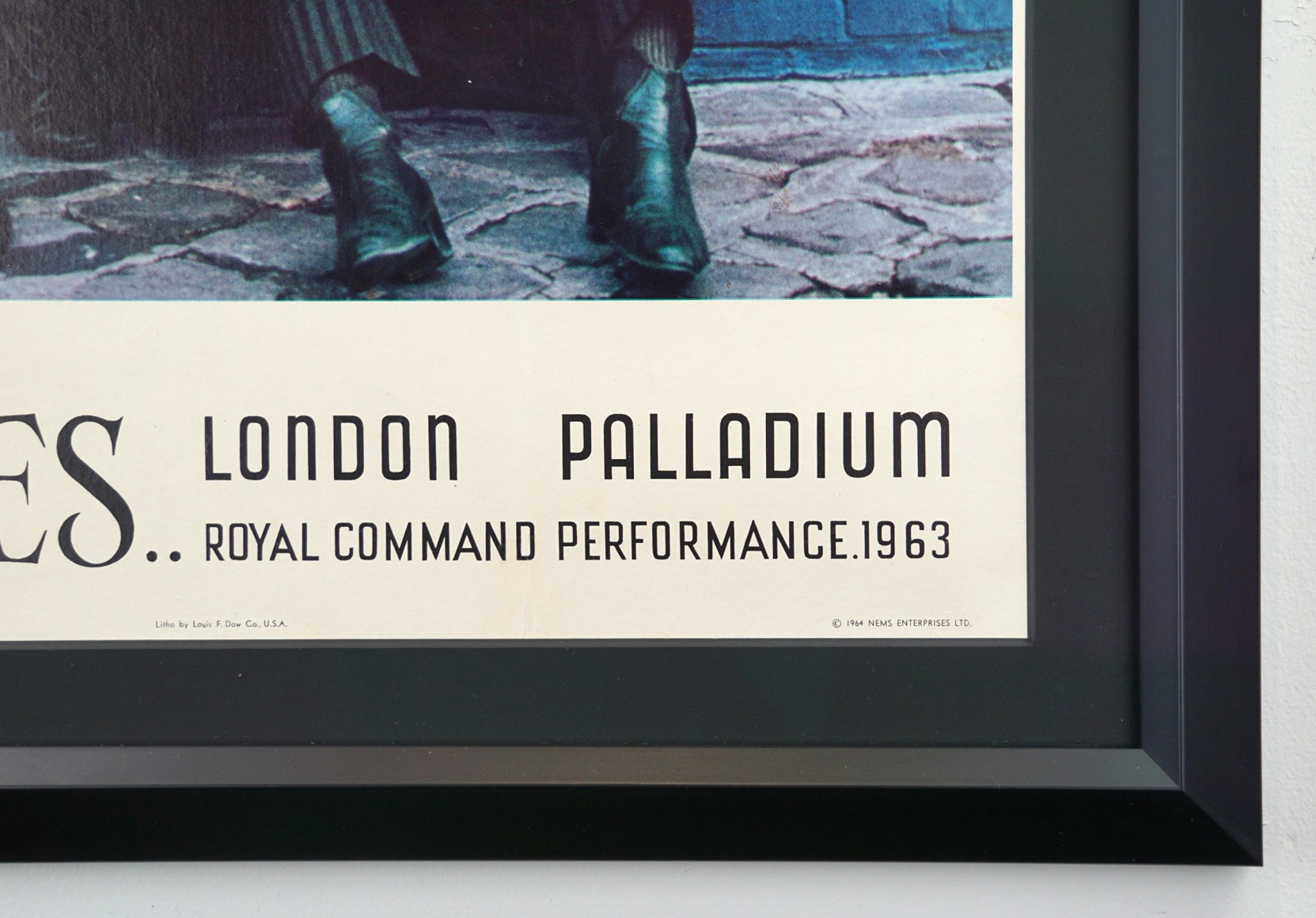 This poster was made to commemorate the Beatles Royal command performance at the London Palladium in 1963 and sold to teens in the US the next year. It was printed on very thin paper as it wasn’t meant to be saved for all these years and was reprinted several times. The originals – like this one – are 20 ½ “ wide and 28 ½” tall while most of the reprints are 24” x 36”. The reprints also don’t carry the printer credit “litho by Louis F. Dow Co., U.S.A. We had this one backed with archival linen to protect it.
