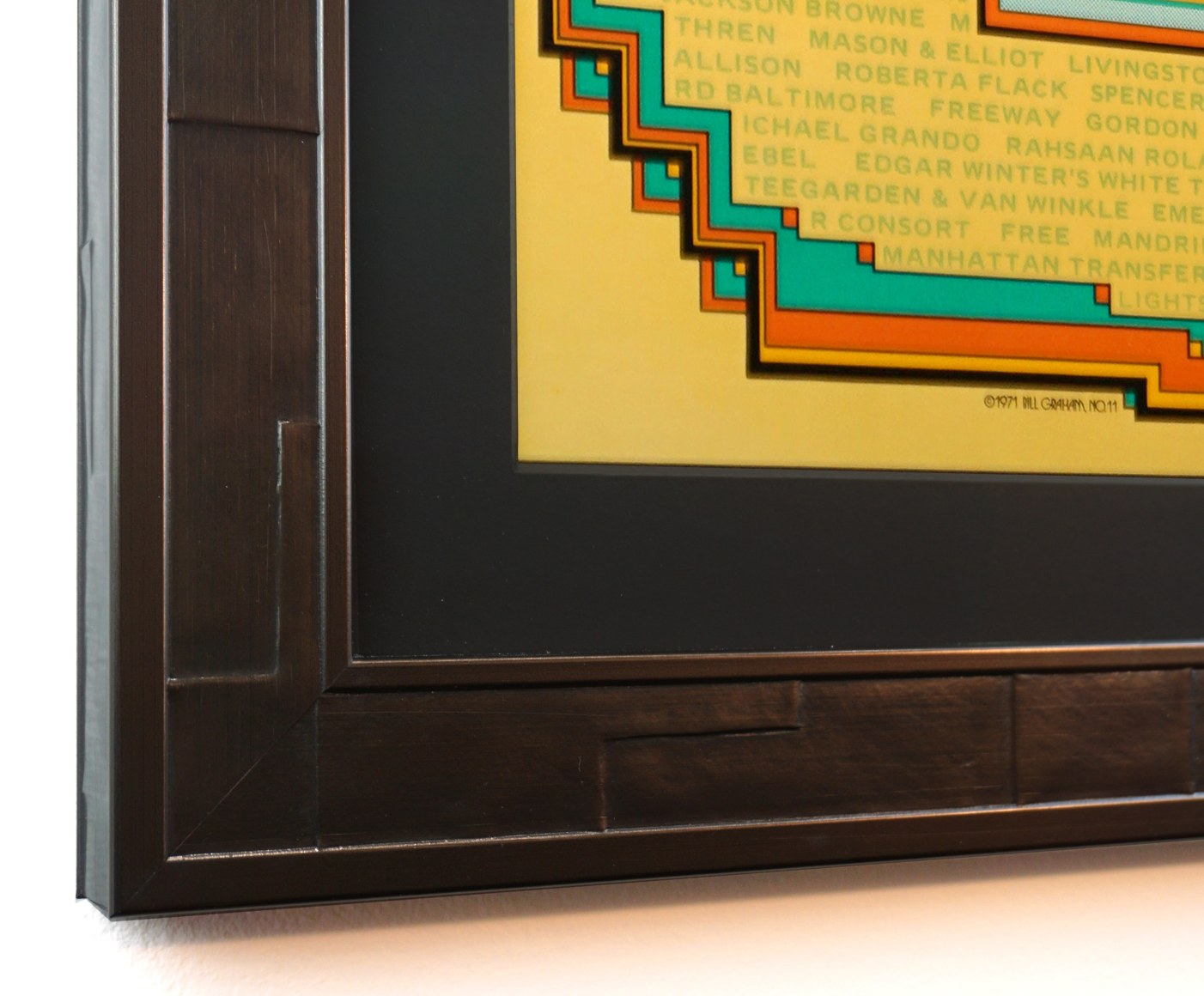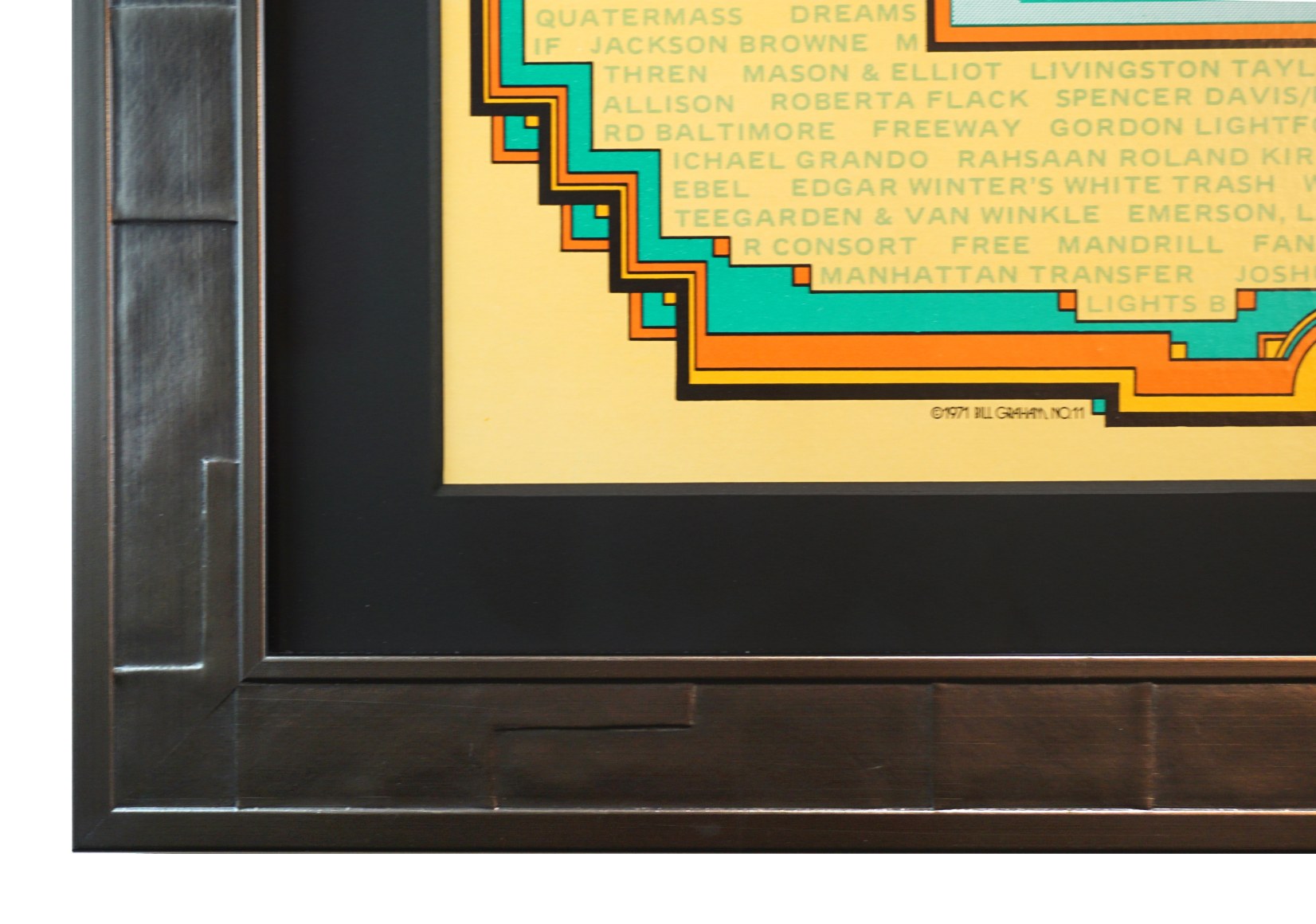 This poster by David Byrd advertised the last month of Bill Graham shows at the Fillmore East. This central portion is surrounded by the names of most of the bands that played the Fillmore East. This poster was printed on thin, poor-quality paper and so this piece has been backed with archival linen to protect it.