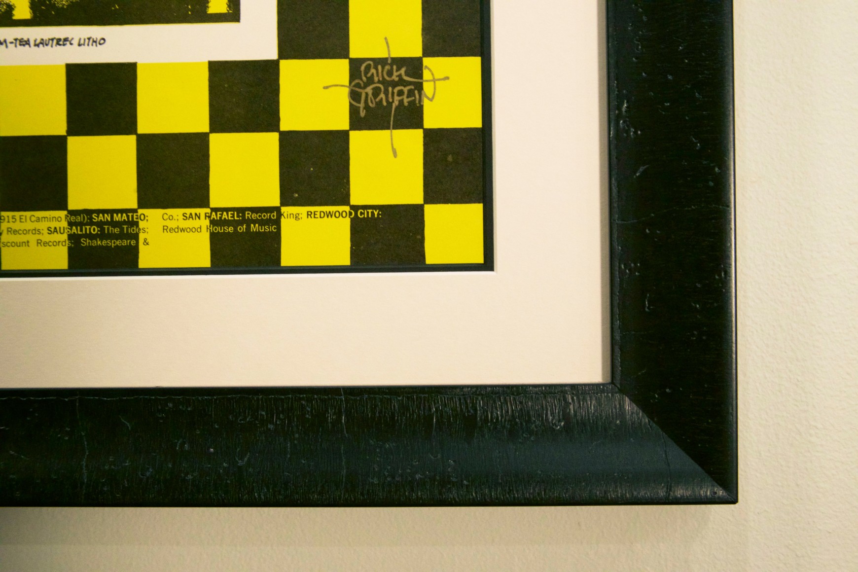 The third and final Rick Griffin and Alton Kelley collaboration (Griffin often collaborated with Victor Moscoso, and Kelley of course worked with Stanley Mouse on virtually all of his compositions) was a good example of both artists' use of contemporary advertising in their design. The poster features a taxi cab checker design with an "Abba-Zabba" candy bar wrapper and image of monkey working on transistor. Abba-Zabbas were candy bars made at the time by the Cardinet Candy Company of Oakland, across the Bay from San Francisco. Perhaps a favorite of one of the artists?
