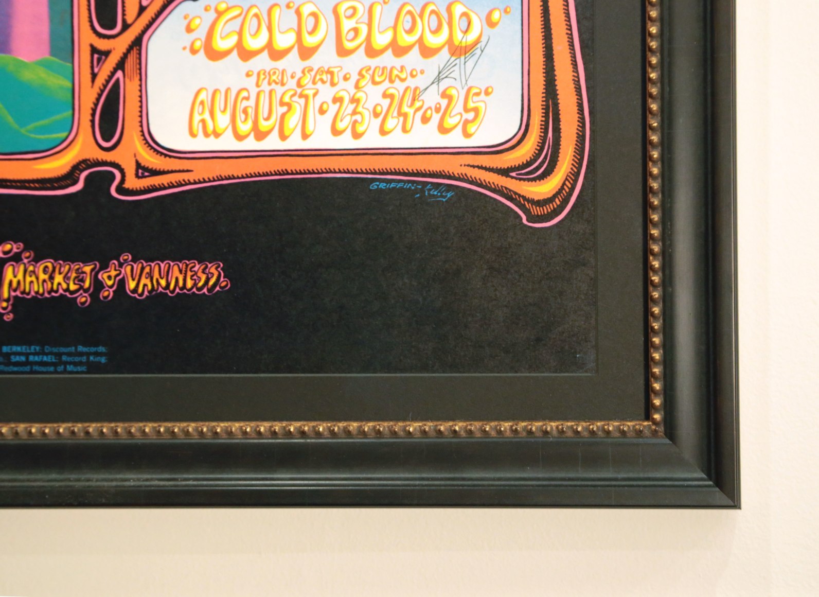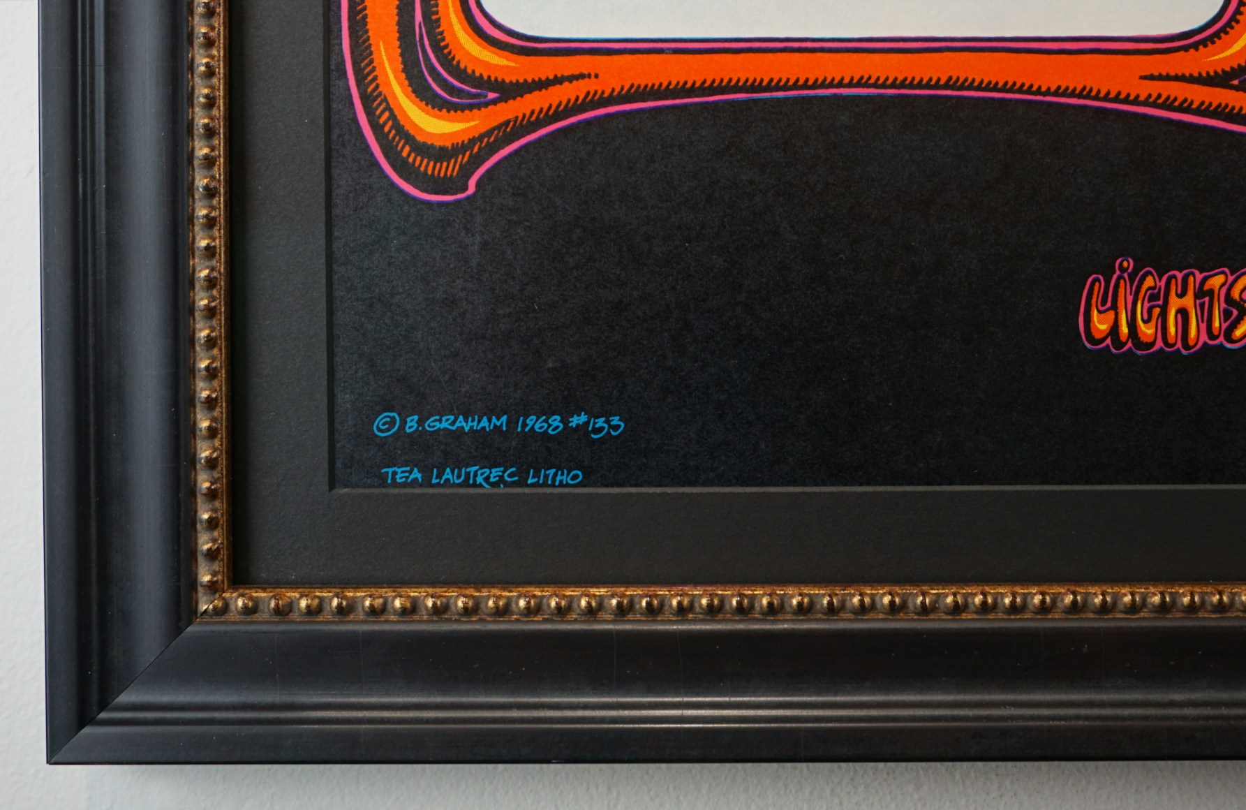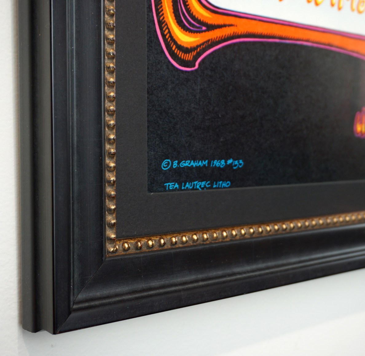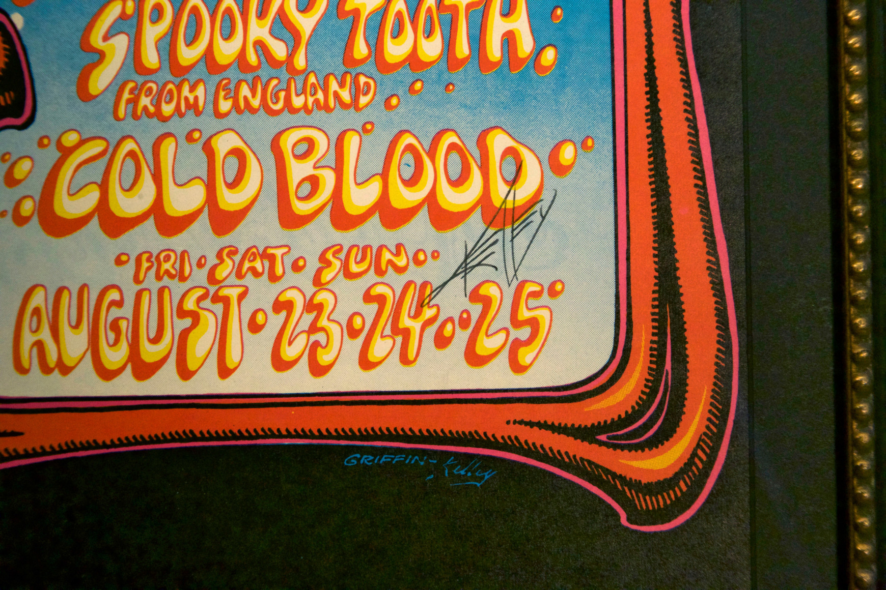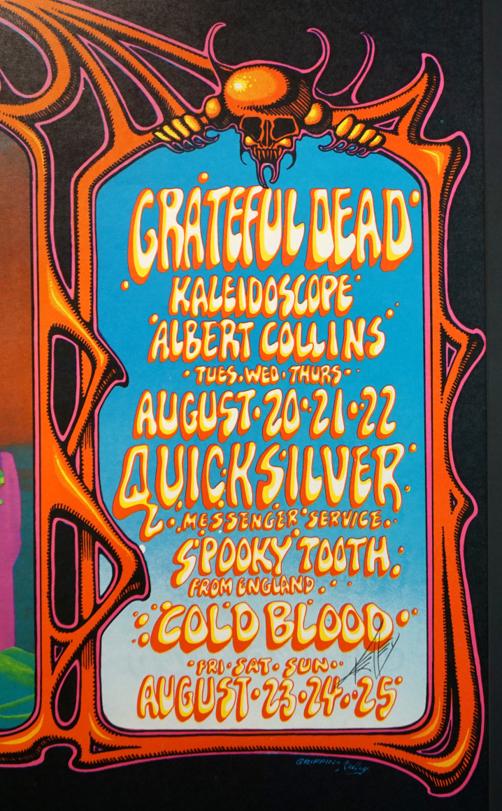 The Who and The Grateful Dead – wow! BG-133 advertised four consecutive Fillmore West mid-week and weekend concerts in 1968. This collaboration by Alton Kelley and Rick Griffin features central design of a ghost-like image with a hand above and below, the lower hand holding some sort of Aztec serpent sculpture. A triptych in design, Griffin used hand-drawn color plates to make 3-D images project from the background, and the frames of the panel appear to be insect legs. The image's central background of an ominous looking mushroom cloud contrasts with the happy bubble-infused, cartoon-style lettering of the side panels.