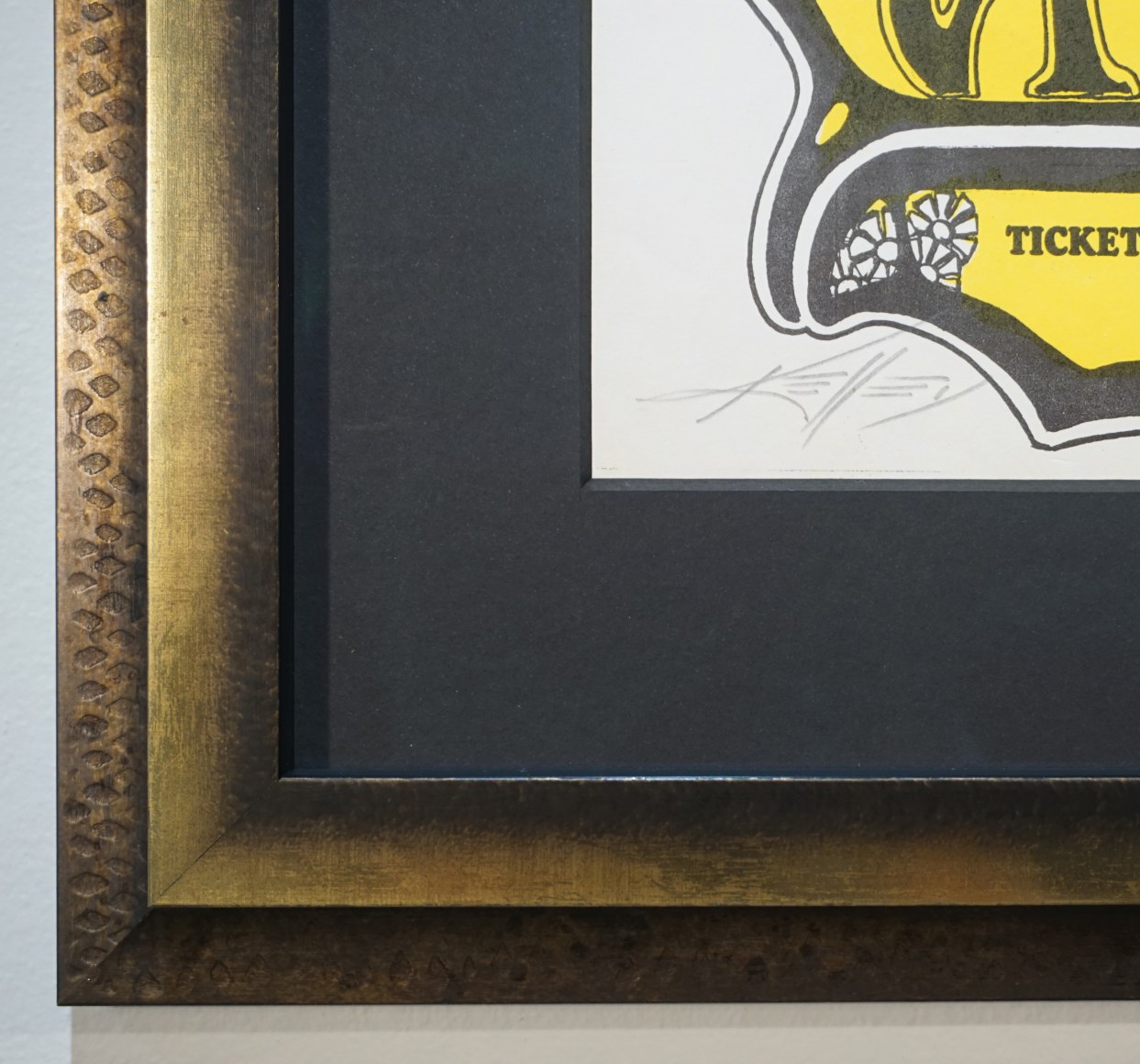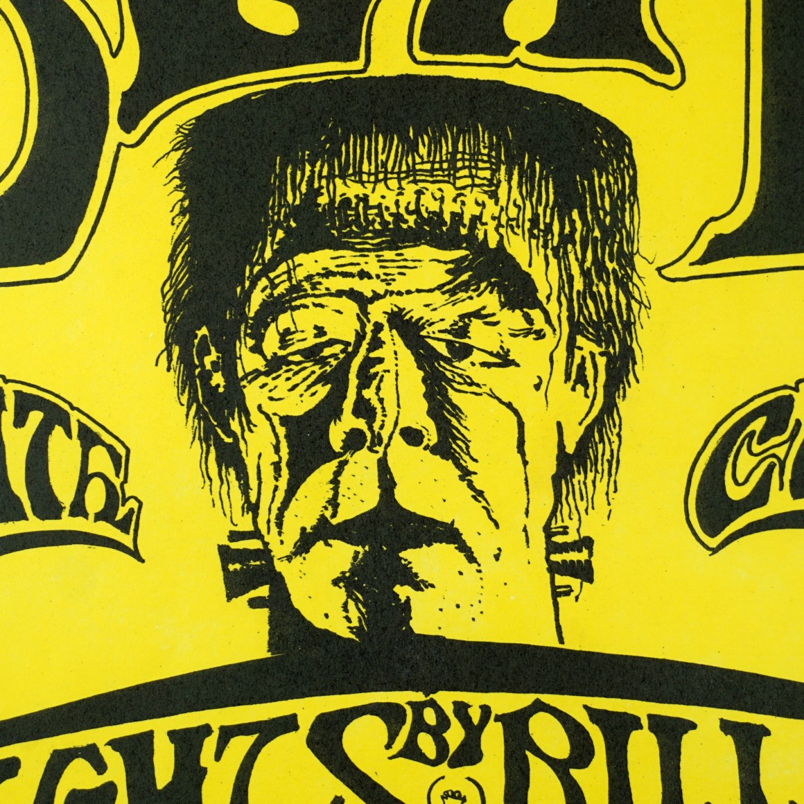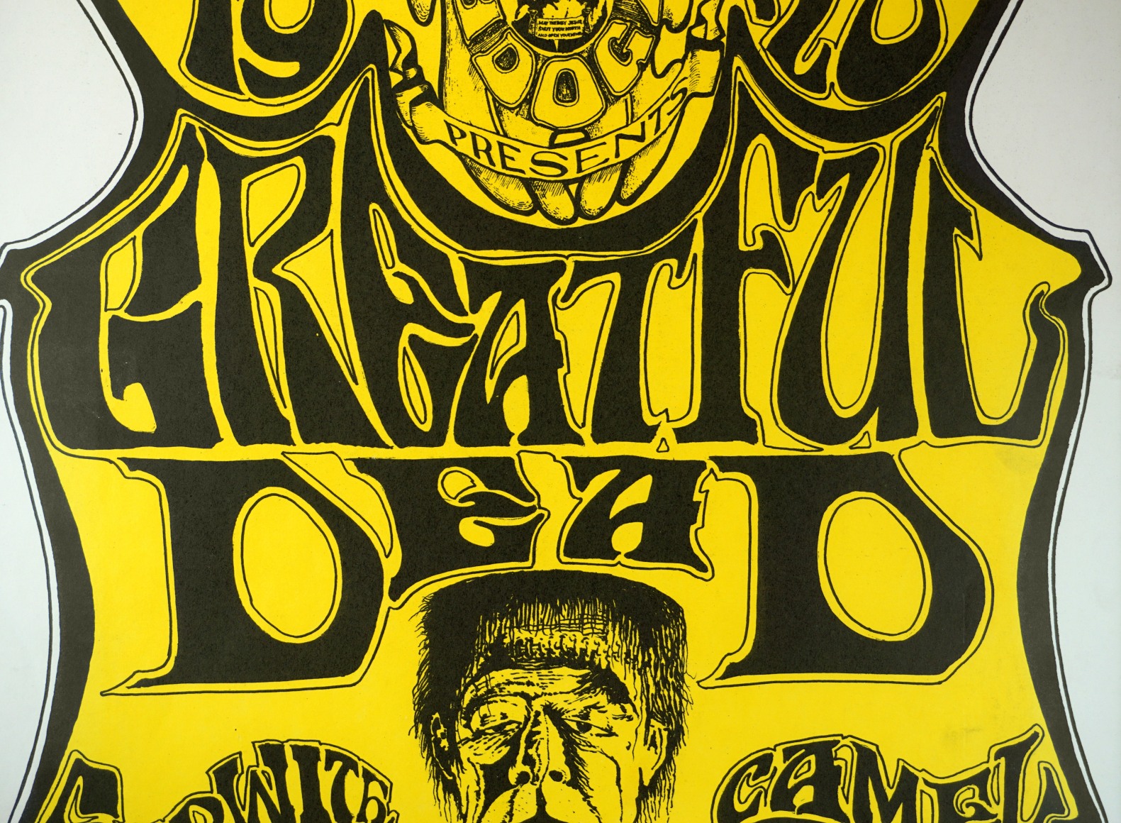 According to Poster Expert Eric King, the Grateful Dead were without a logo and the SF poster artists had been trying to supply that inspiration to the band when they had a chance to highlight them in a poster. This was the second try, following Wes Wilson’s, “The Quick and The Dead” poster from June of 1966 featuring a Jose Posada image. While Frankenstein did not win, the third time was the charm as the poster Mouse and Kelley designed for the Dead in September 1966 featured the well-known skeleton and roses image and the rest was history.
