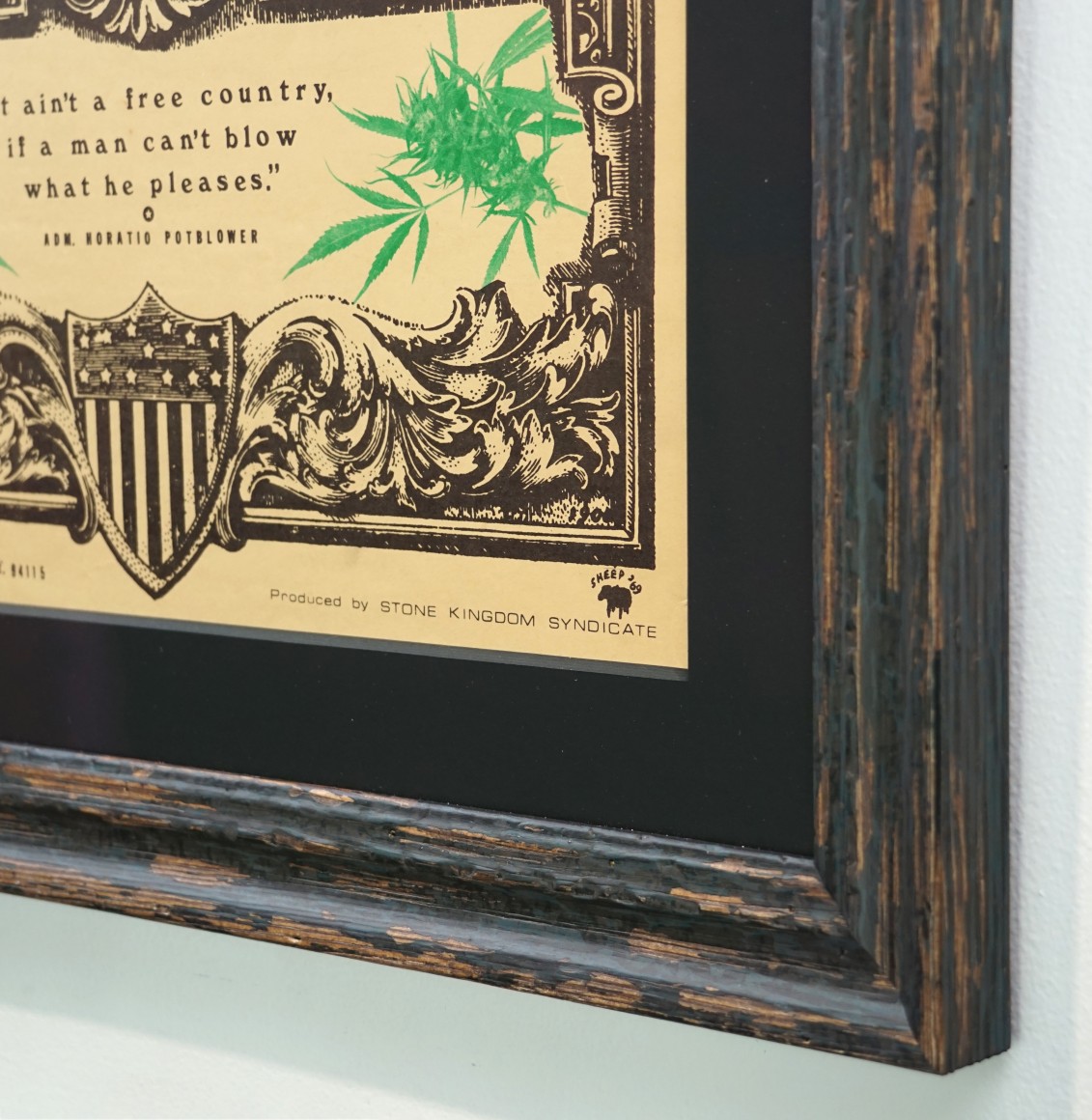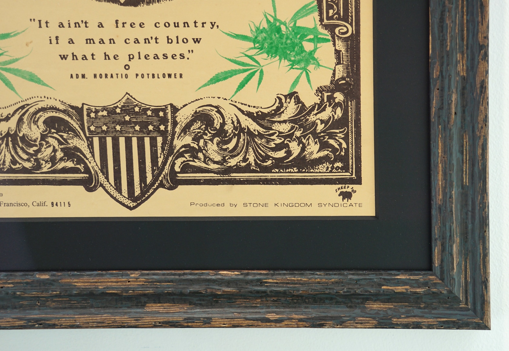 Hornblower’s stoned doppelganger, Admiral Potblower, is urging God to save the seeds instead of the Queen. And he declares, "It Ain't A Free Country, If A Man Can't Blow What He Pleases." The poster was made by “Sheep” and the company Stone Kingdom Syndicate and published by Graphoto in San Francisco, one of hundreds of printers around the country meeting the demand for posters during this time.