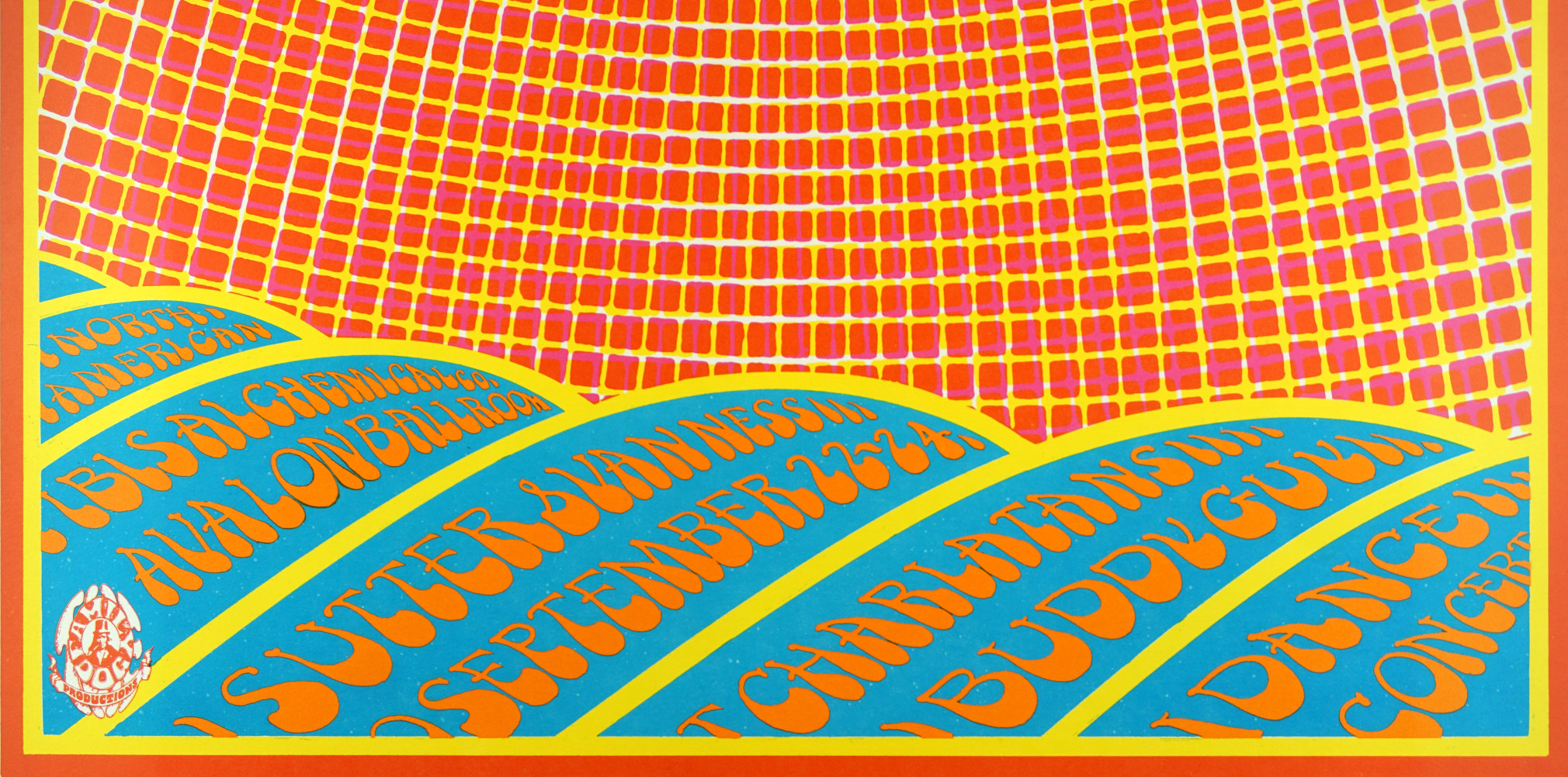 This poster featuring Icarus flying way too close to the sun could be a gridded representation of what staring at the sun with your eyes closed looks like. Well, maybe on LSD, but regardless, it’s an arresting image above some extremely psychedelic lettering for the Avalon Ballroom and the Charlatans and bluesman Buddy Guy.