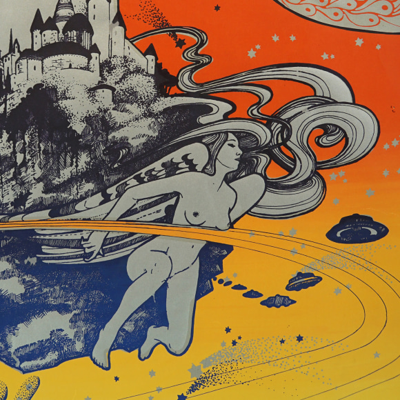 The poster depicts a naked winged woman pulling an island through space. This represents a type of UFO or fantasy island, from which various flying machines are emerging (planes, flying saucers, dirigibles, shooting stars). On the rocky island is a city, with banners above it that say: "Night of the UFOs." The assertion of famous architect and visionary Buckminster Fuller, that we should view our planet Earth as a spacecraft influenced the design of the poster. A bi-plane flying below the island is leaving a vapor trail that reads: "July 28 pink floyd."