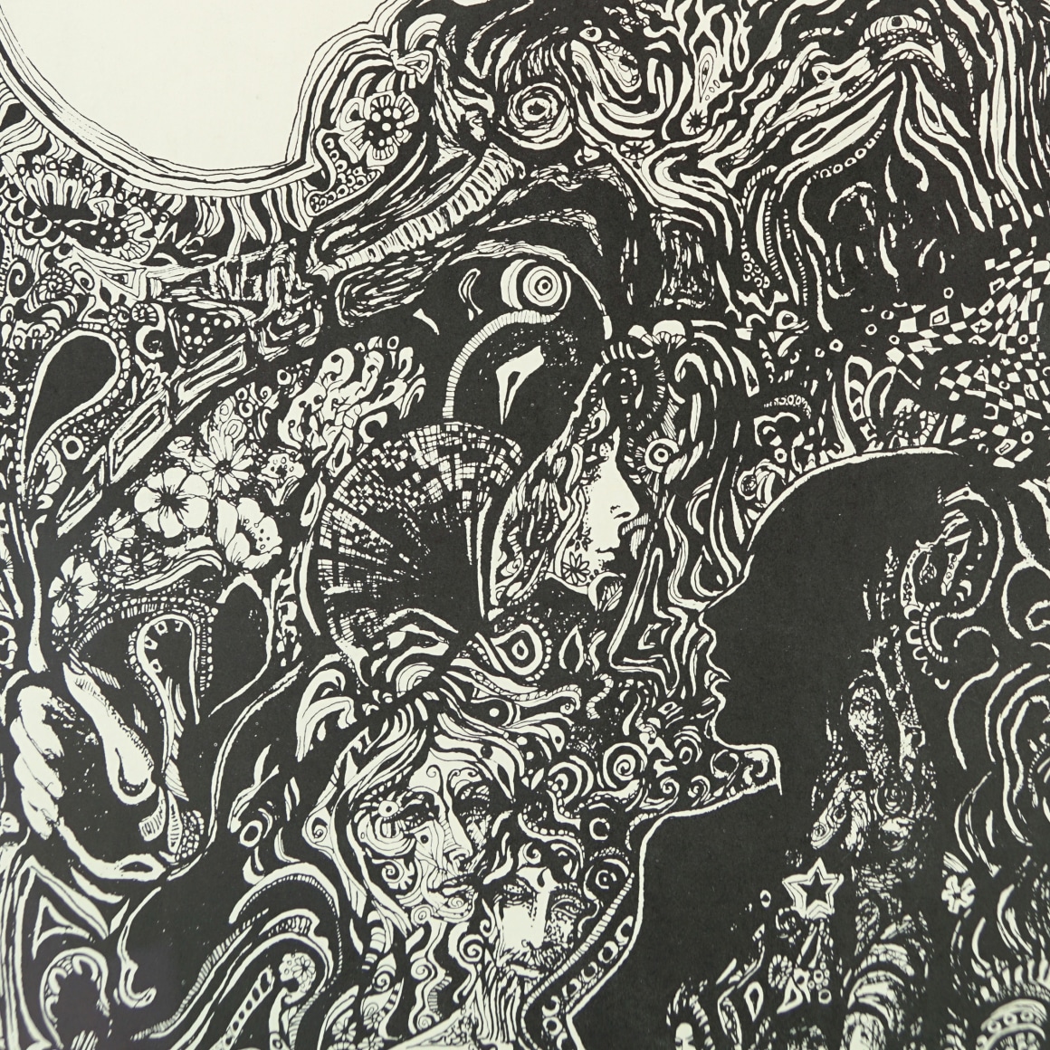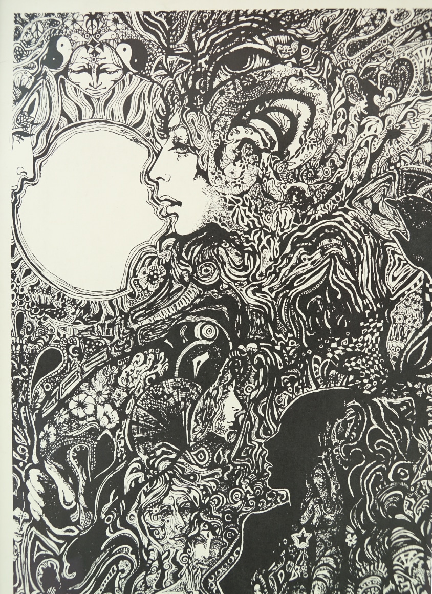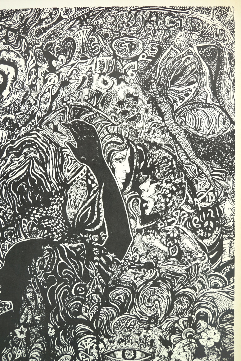 The poster reflects the psychoactive effects of being stoned on pot or tripping. There are a number of words hidden in the poster as well as many faces and figures. “Acid” appears in a few places, but also STP, LSD 25, Faith, Peace, and Love. At the bottom towards the right we get the name of the artist, Donna Dichter.
