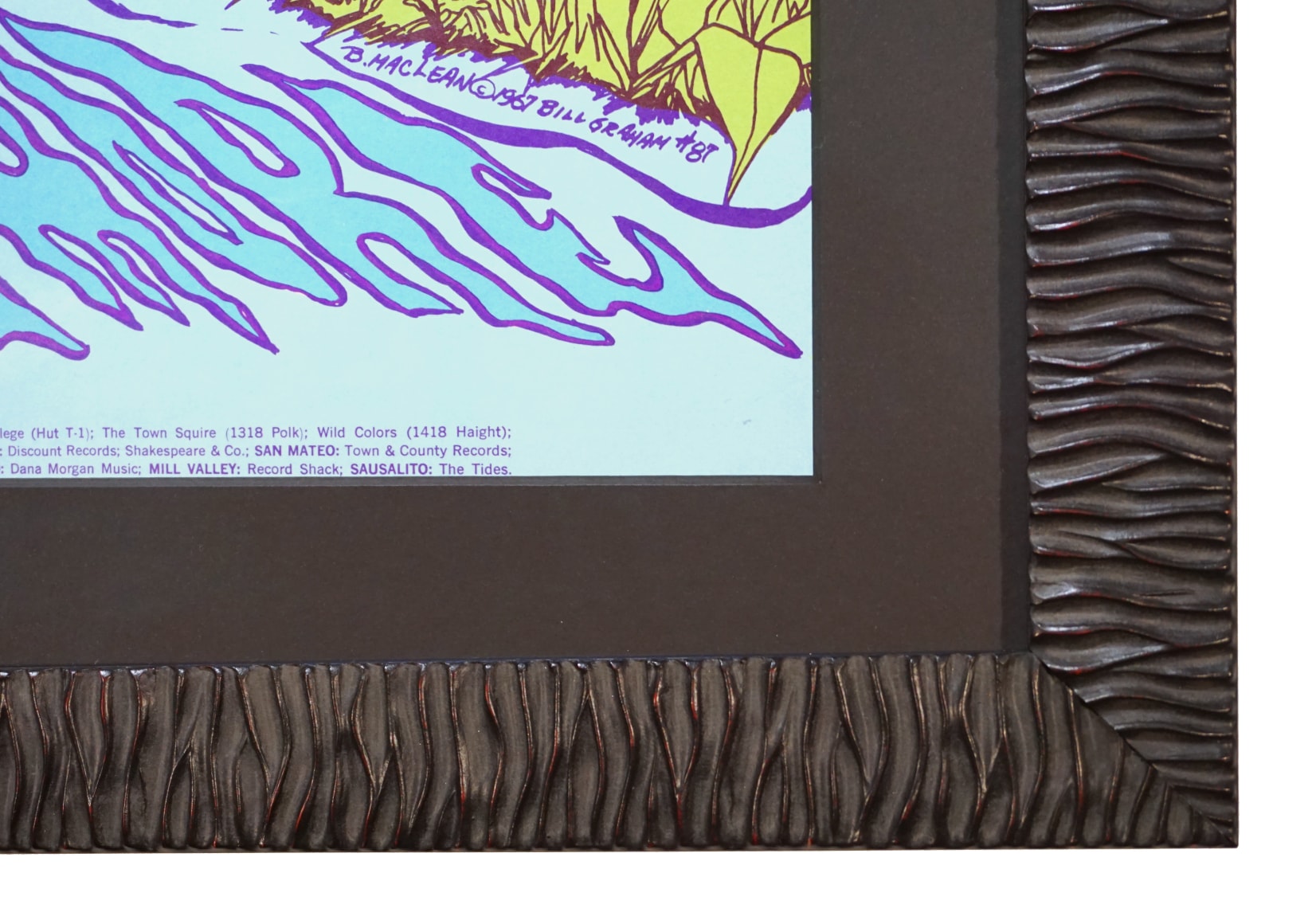 This colorful poster was one of the most popular of the Fillmore series designed by Bonnie MacLean. MacLean was married to Bill Graham and stepped in to design many Fillmore posters after Wes Wilson was fired.