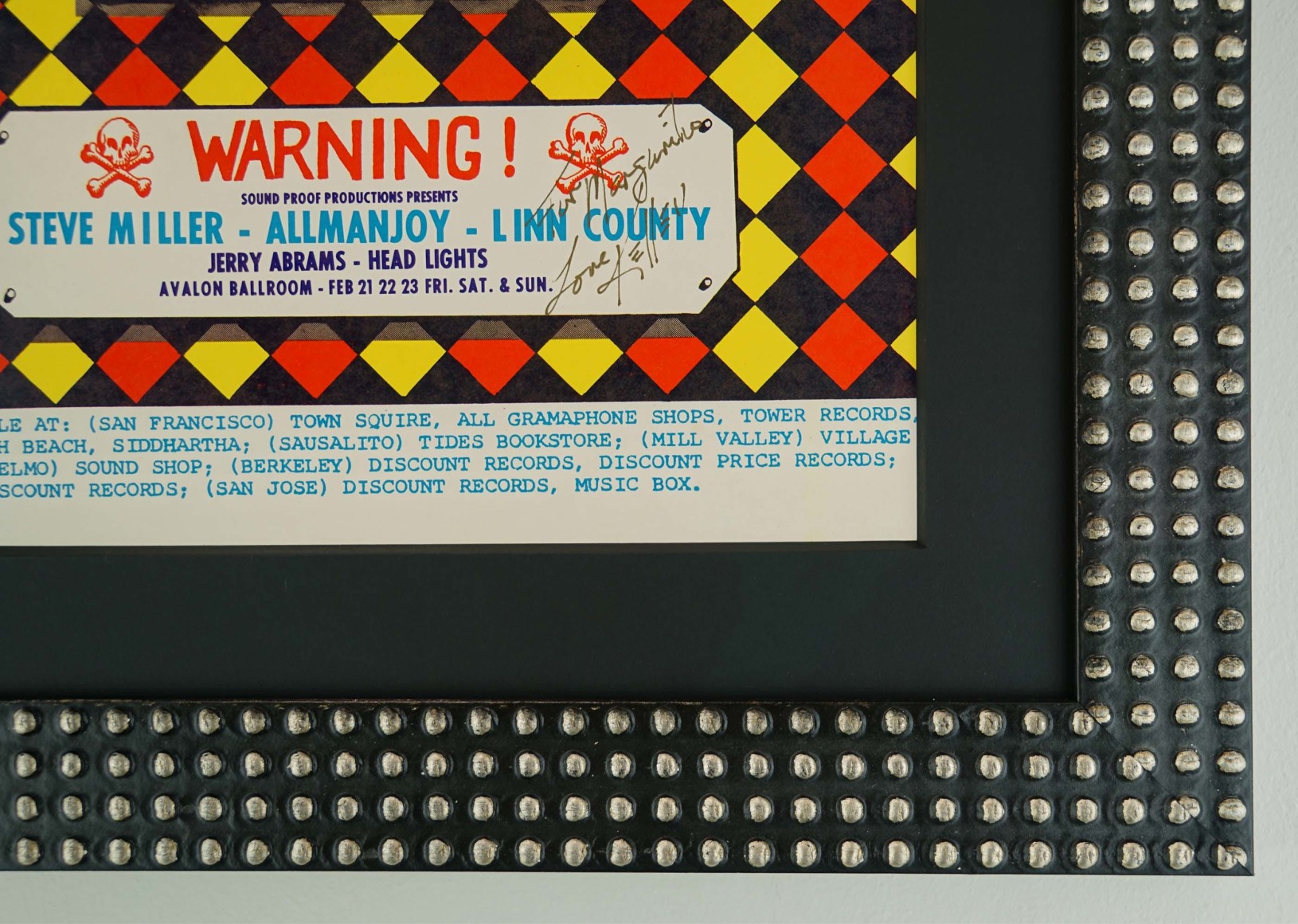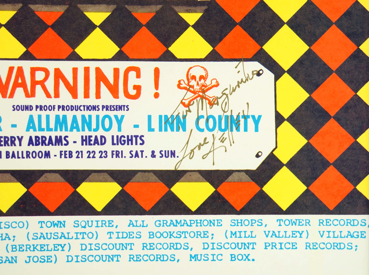 This very cool poster was used for a Soundproof Production show at the Avalon Ballroom in February 1969. Steve Miller, Allmen Joy, and Linn County provided the music and Jerry Abrams provided the light show. Soundproof Productions moved onto the scene in 1969 after Chet Helms’ Family Dog lost it’s lease at the Avalon Ballroom in November 1968. Notably, Soundproof produced the late January 1969 shows by the Grateful Dead, some of which became part of the “Live Dead” album, and the poster they paid for to advertise those shows was the famous Aoxomoxoa poster by Rick Griffin.