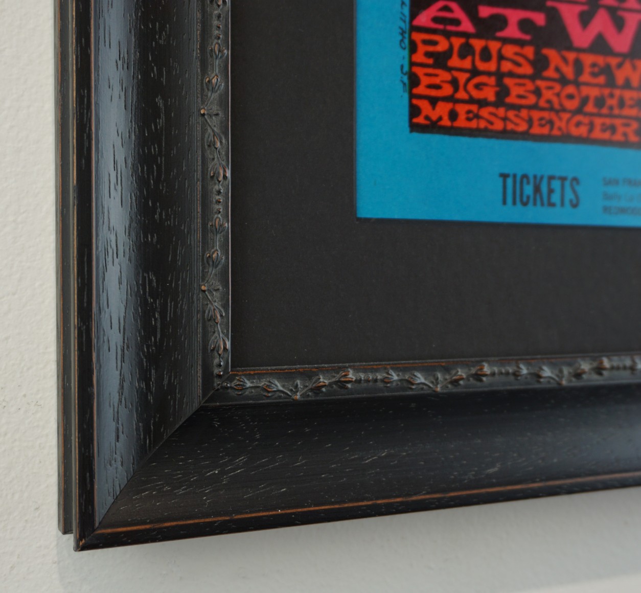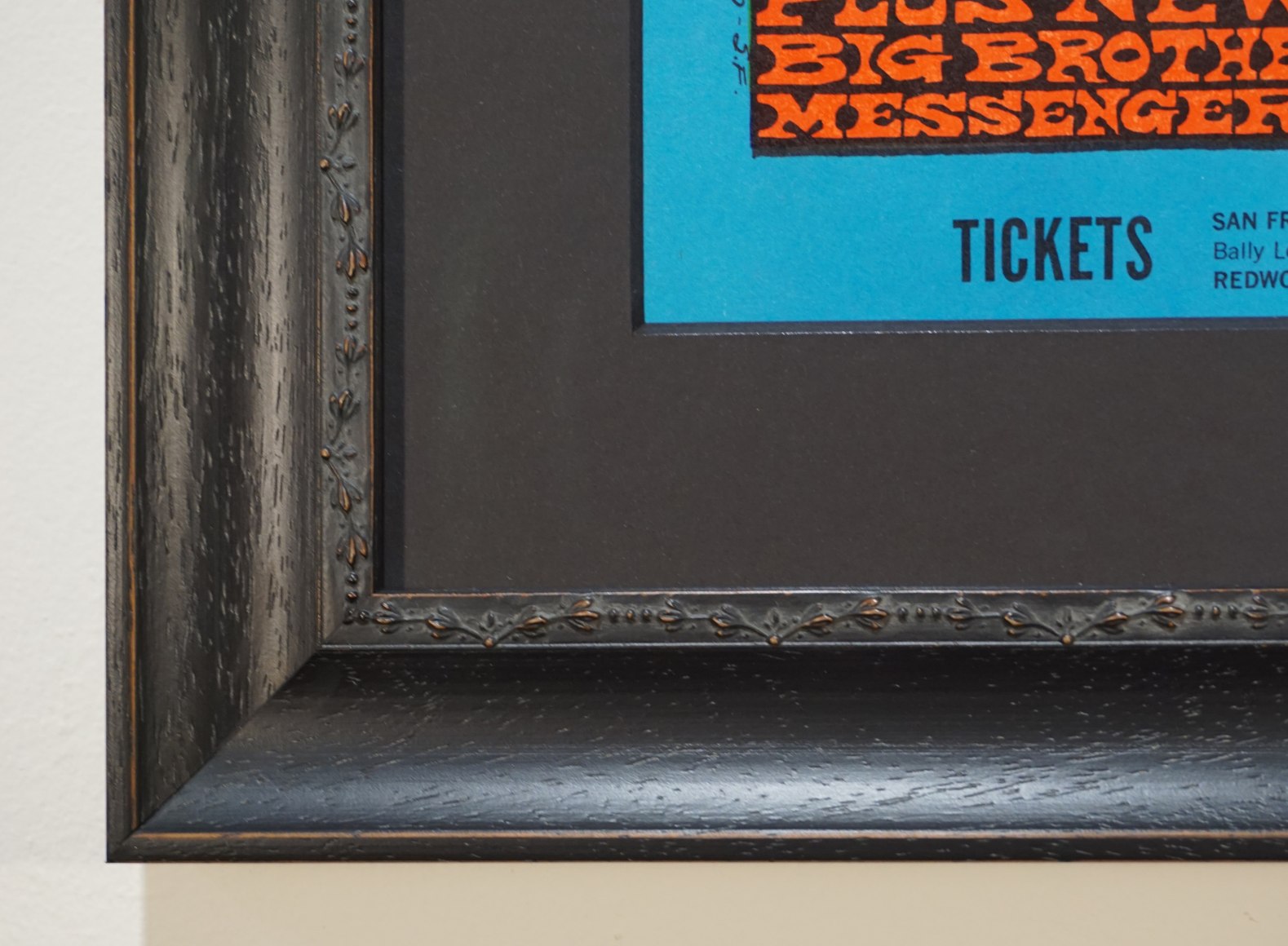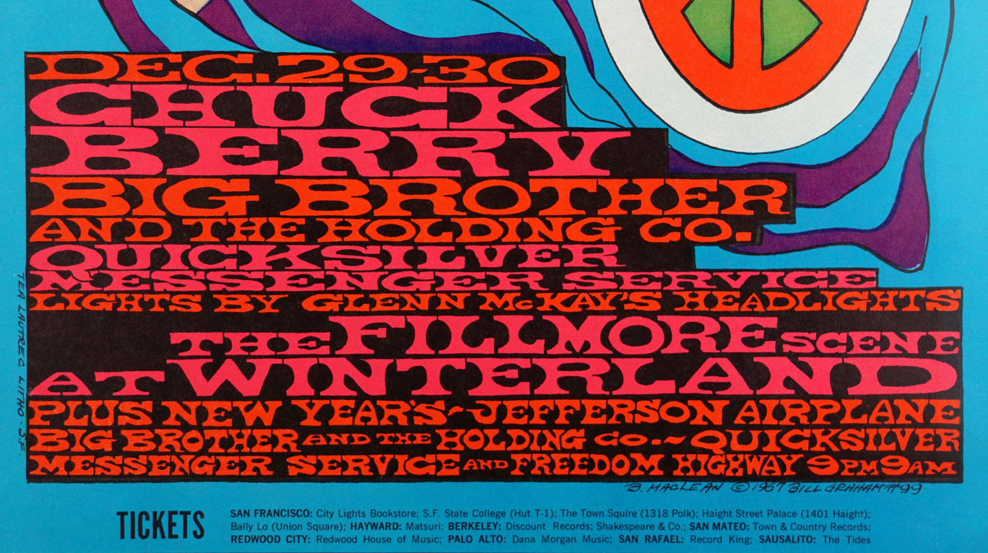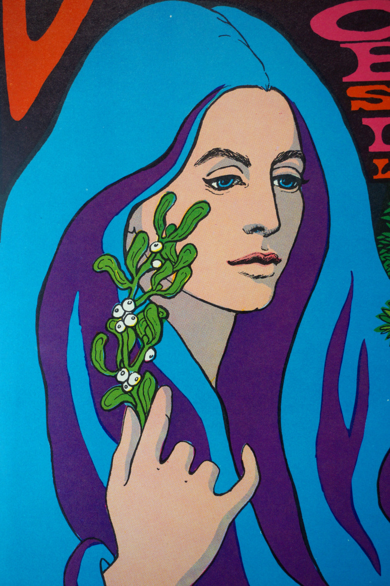 Billed as “the Fillmore Scene at Winterland,” this popular poster was designed by Bonnie MacLean for year-end shows wrapping up the year of the Summer of Love. This colorful piece was one of the most popular of the Fillmore series designed by Bonnie MacLean. MacLean was married to Bill Graham and stepped in to design many Fillmore posters after Wes Wilson was fired in the Spring of 1967. This poster was typical of her flowing style with a beautiful woman offering both peace and love in the form of mistletoe.