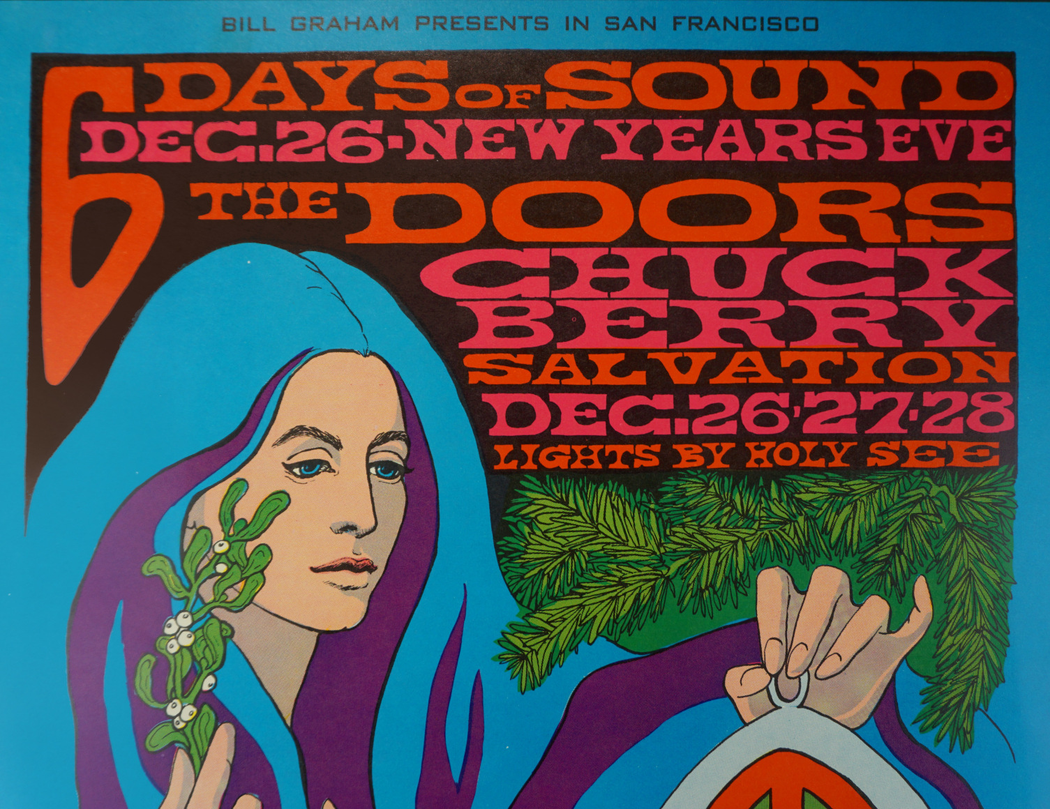 BG-99 Doors Poster 1967 with Chuch Berry, Jefferson Airplane, Quicksilver and Big Brother & the Holding Co. at Winterland News Year 1967-1968 by Bonnie MacLean called Six Days of Sound