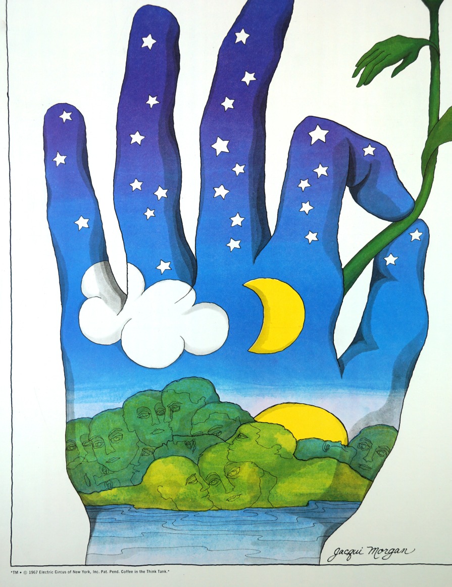 Jacqui Morgan, (Feb. 22, 1939 – July 3, 2013) born Jacquelynn Morganstern in New York, was an American illustrator, educator and watercolor painter. She became influential during the 1960s and 1970s with the youthful and psychedelic style of her illustrations. She was one of the first female commercial illustrator/designers in the United States. This 1967 poster for the New York City club Electric Circus is considered a milestone of 20th century graphic design.