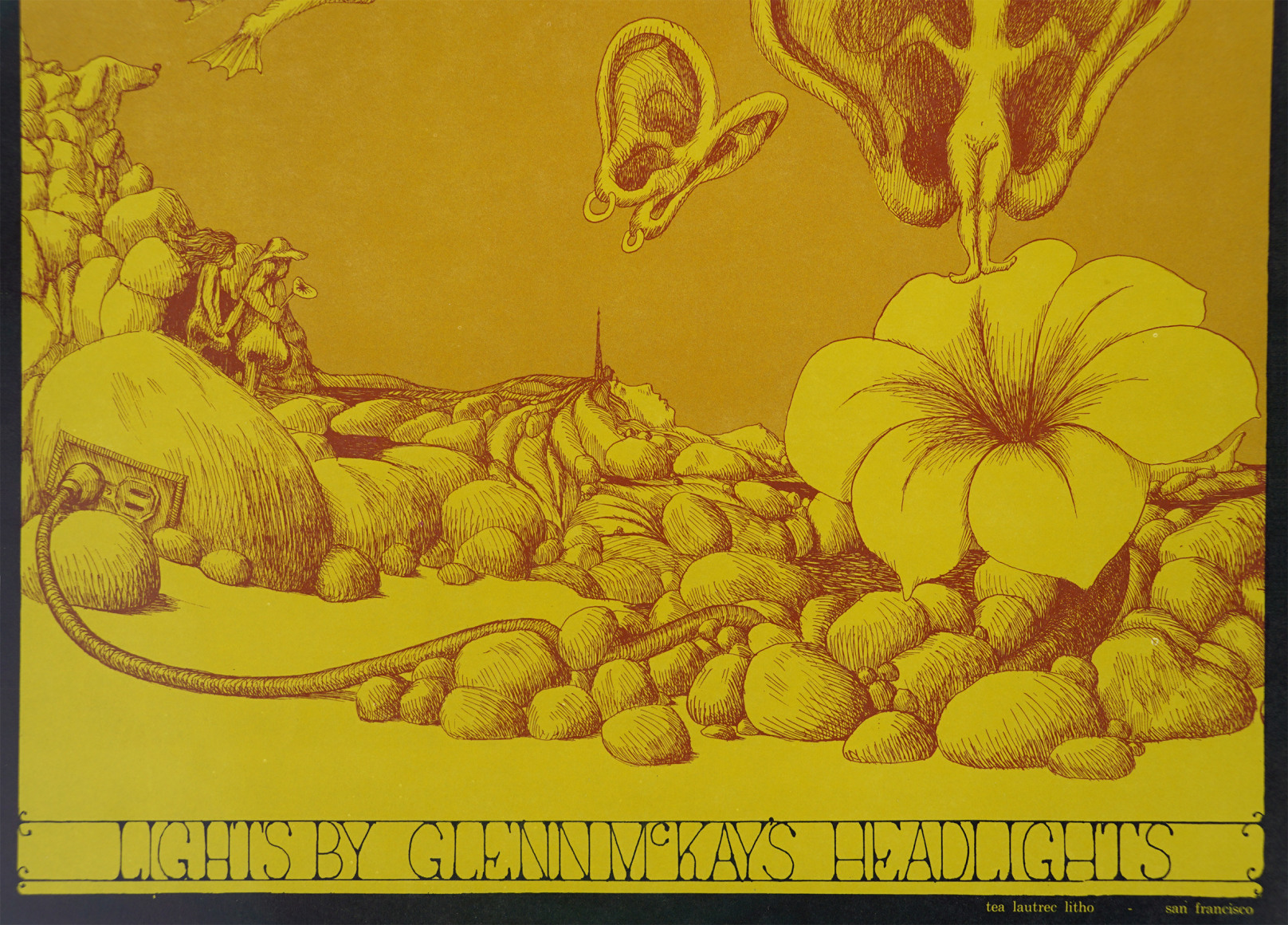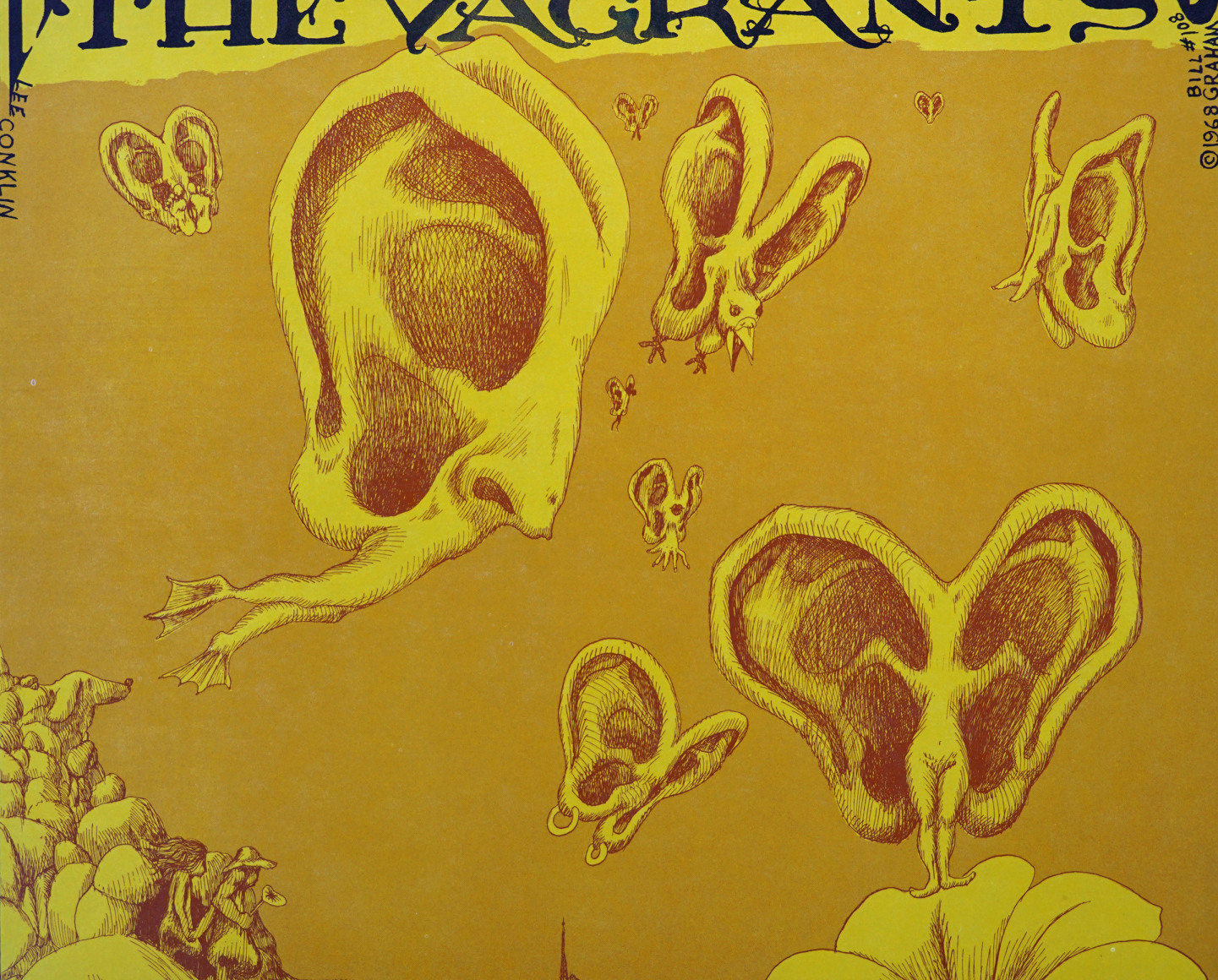 Poster artist Lee Conklin was fascinated by all body parts, to wit the butterfly ears in this wildly creative and unique poster. Conklin studiously tried to integrate his psychedelic-high visions into his poster art, filling lettering and sketches with hidden, convoluted image upon image. Once one deciphered the Who and Cannonball Adderly in the heading, the eye could wander to the bottom sketch, rife with reference to unfettered nature, the electronic age and wonders of the inner mind.