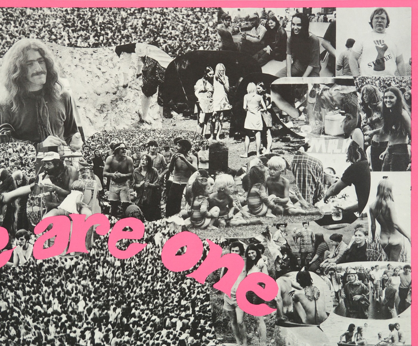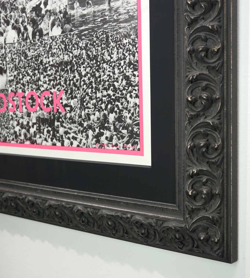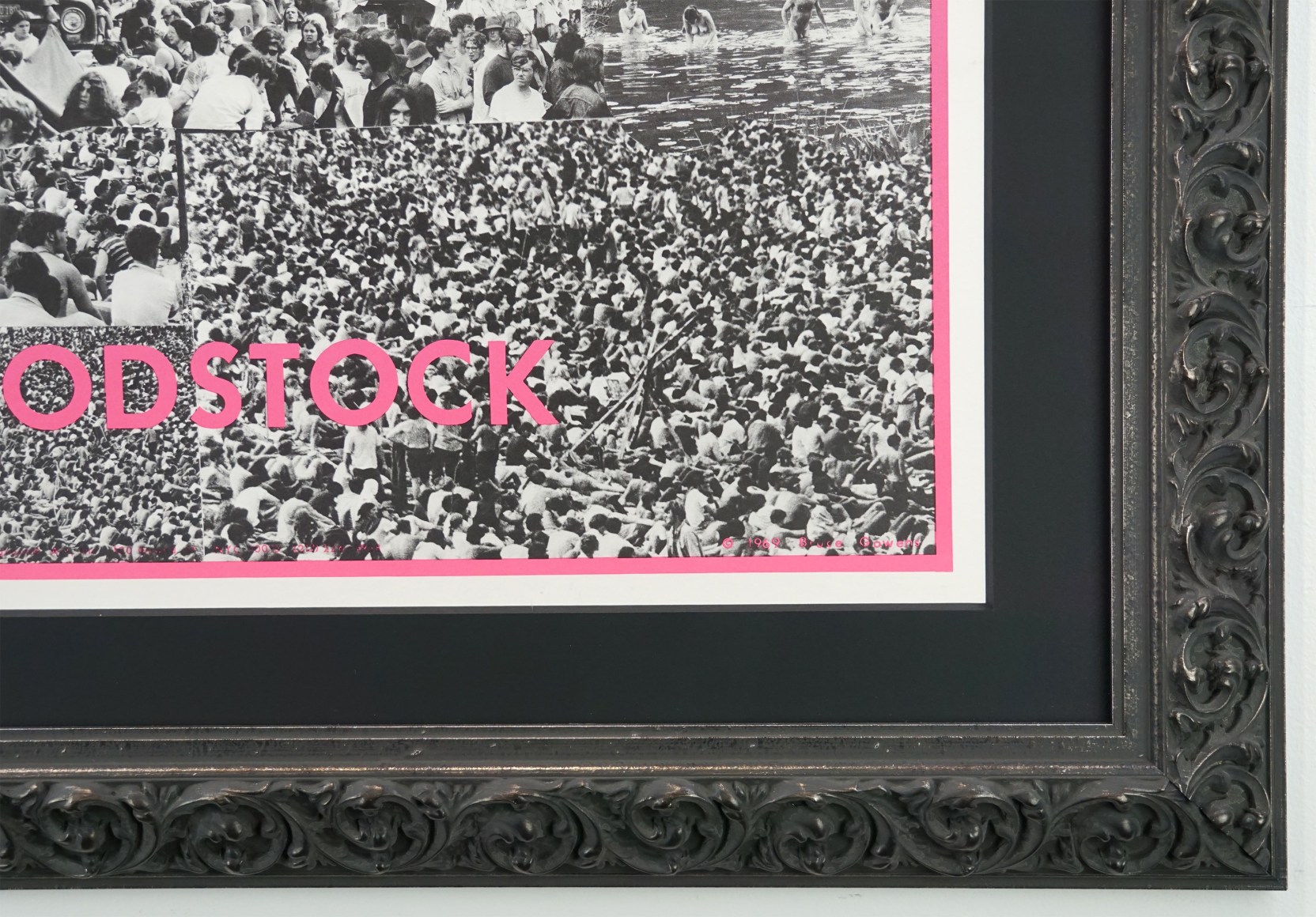 This huge collage of Woodstock photos was created by Bruce Gowens right after the event and published in 1969. There was also a version made with dark green lettering instead of the pink seen here. These posters were printed on thin paper and were easily damaged or ripped and very few are left, although it is impossible to know how many. We had this one backed with archival linen to stabilize and protect it before framing it with Museum Glass.