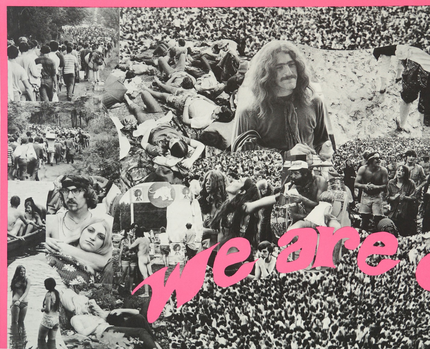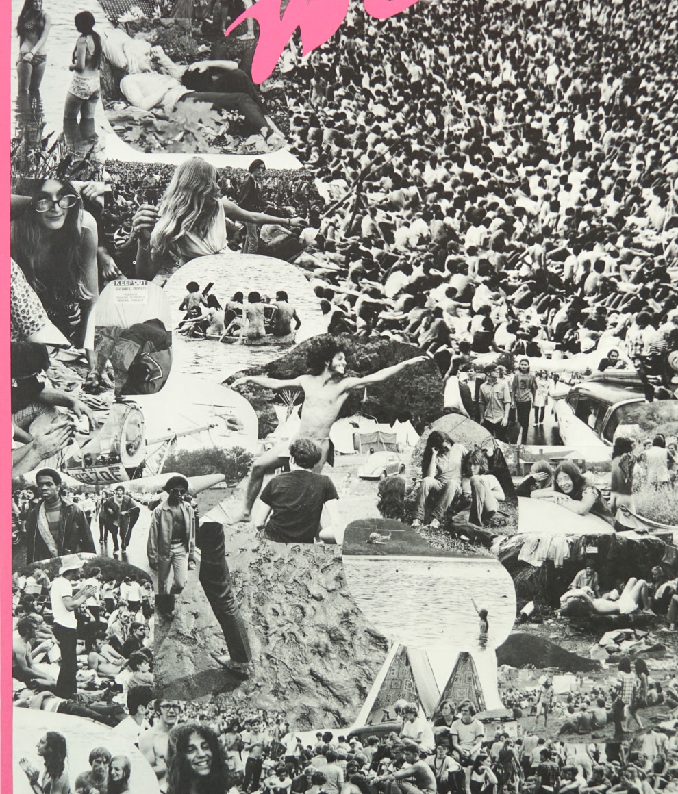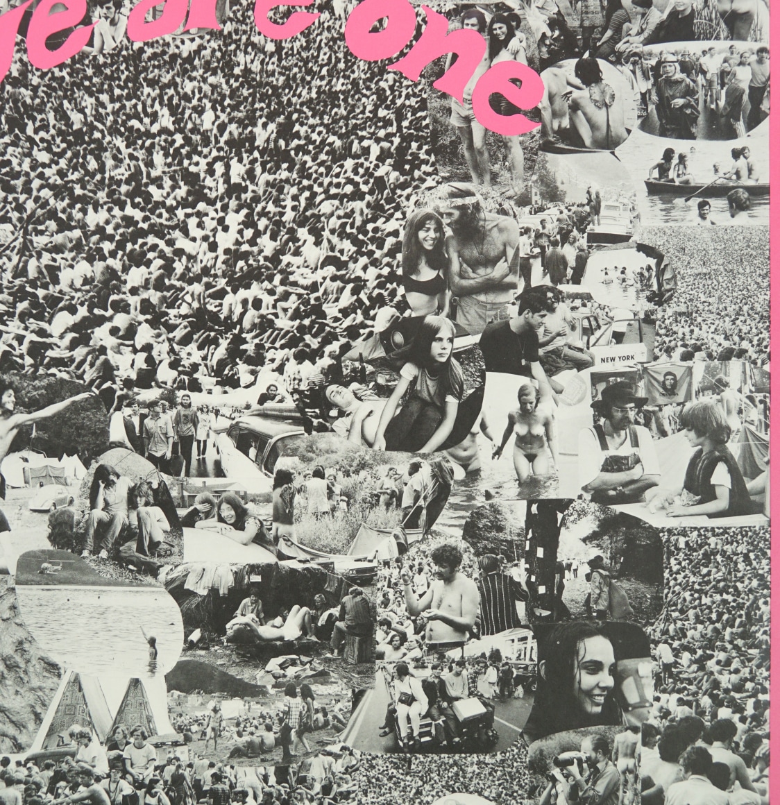 This huge collage of Woodstock photos was created by Bruce Gowens right after the event and published in 1969. There was also a version made with dark green lettering instead of the pink seen here. These posters were printed on thin paper and were easily damaged or ripped and very few are left, although it is impossible to know how many. We had this one backed with archival linen to stabilize and protect it before framing it with Museum Glass.