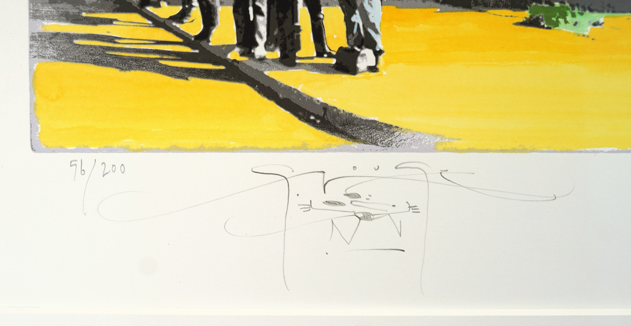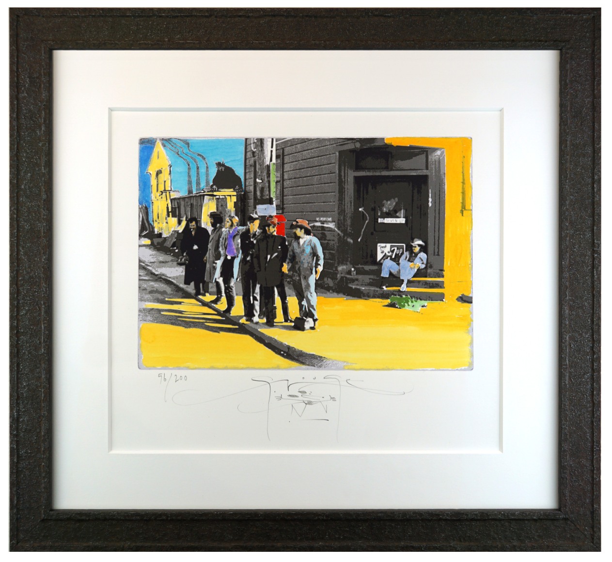 Note that in the full band image, the six band members at the time are joined by Robert Hunter. He is on the far left in a large black coat with old-timey lunch pail in hand. Also, for this serigraph, Stanley Mouse has added some sort of looming giant mole creature to the right of the three smokestacks that was not on the original cover image.